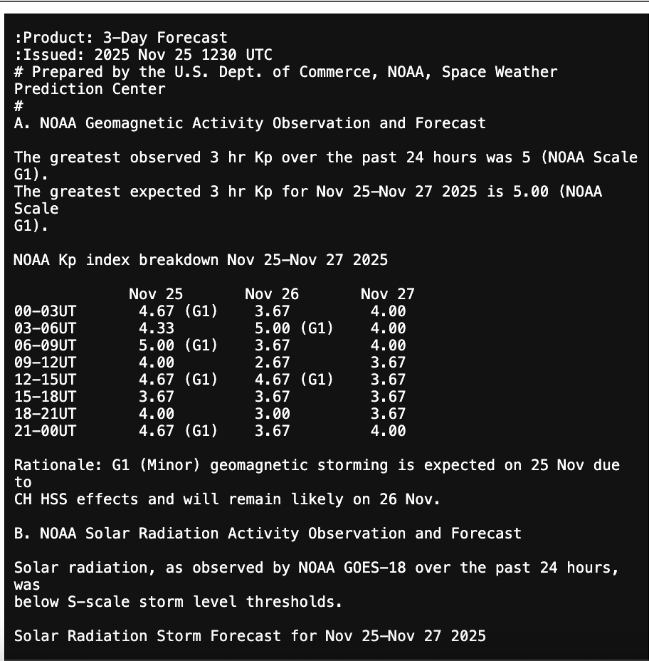 The G1 level storming NOAA/SWPC predicted for tonight into tomorrow morning is coming earlier than forecast yesterday, which is good news, because if this pans out, it will still be dark. Looks like an active G1 period forecast from 11 pm- 1 am local Maine time. If you look at the Nov 26 column on the three day forecast image below, you’ll see the time 03-06 UT, with G1 next to the number 5. That’s 5 kP, which gets us into the mild geomagnetic substorm region.